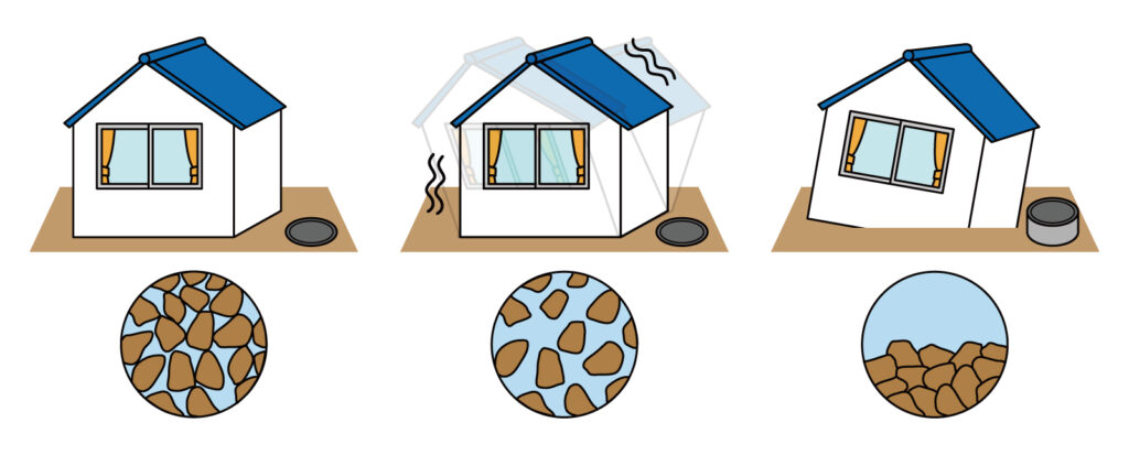 液状化現象は、主に**「緩く堆積した砂の地盤」と「高い地下水位」、そして「強い地震の揺れ」**の3つの条件が揃ったときに発生します。
